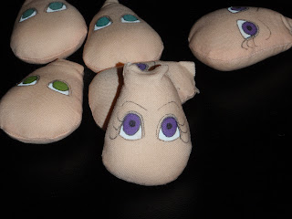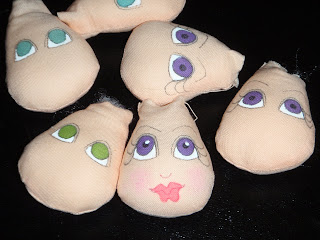 First, using a Micron Pigma pen .03 I draw the outline of the eye – kind of like a hill with a line underneath it.  Than I draw the eyelid.  Then I draw in the pupil.  As you can see, even though I have painted hundreds of faces over the years, I still make mistakes.  I always sew and stuff more heads than I need.  So if I’m making 6 dolls, I will make up to 10 heads – always need to have some spare.