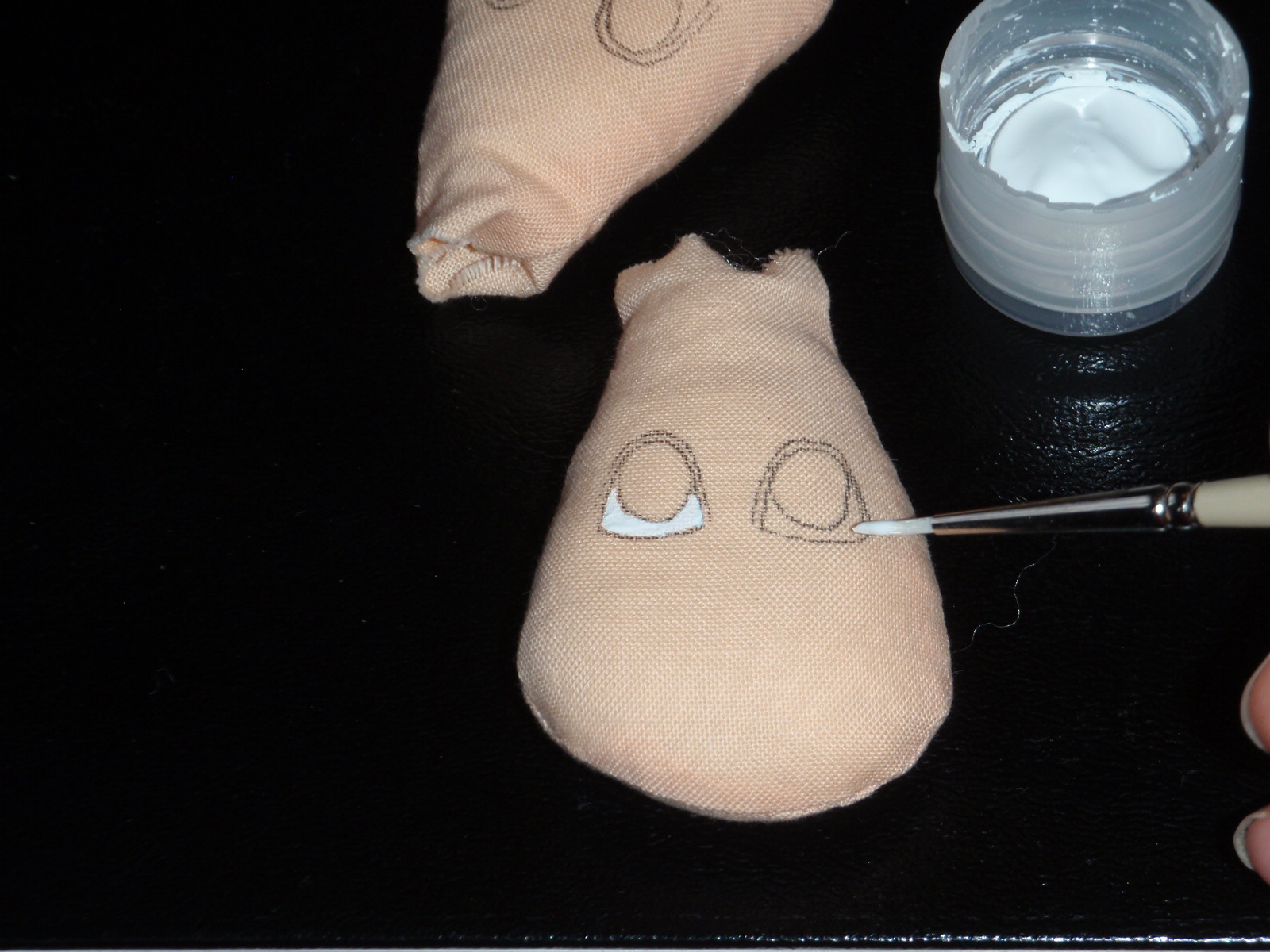 Now, time to paint the white of the eye.  I am using a fairly thin white fabric paint and a very small 000 brush.  Be careful when painting – take your time.  If you go over the ‘line’ as I often do on these very small heads, don’t panic too much.  You can touch it up later.  Now it’s really important to wait for the whites to dry…the wet paint clogs up the pens terribly – the pens are expensive, so you have to look after them.