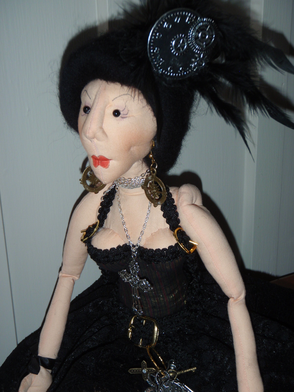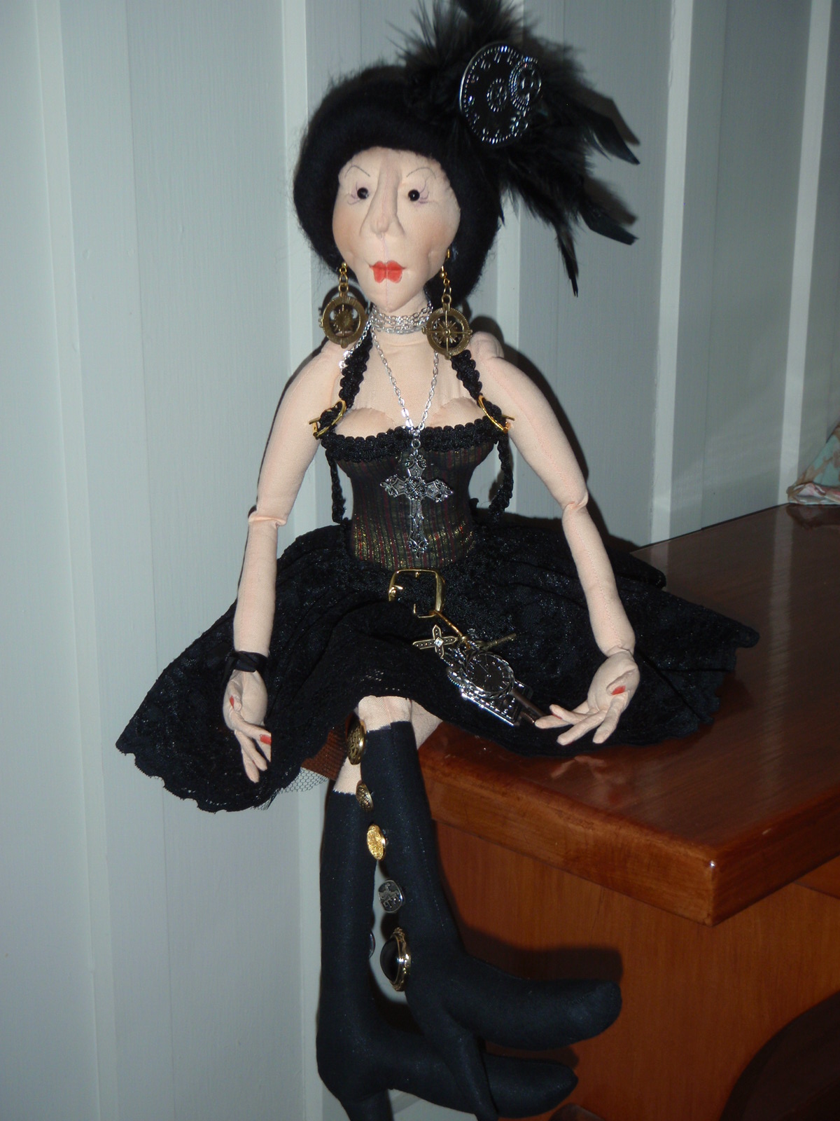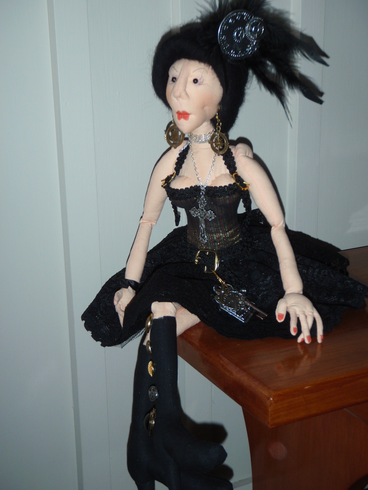 Using Victoria pattern, I have made her a steampunk rag doll. The ‘straight’ Victoria has a simple drawn face…I decided to paint a ‘real’ eye and lips to go with the alternate theme. I have used the wonderful steampunk fabric I got from the US.