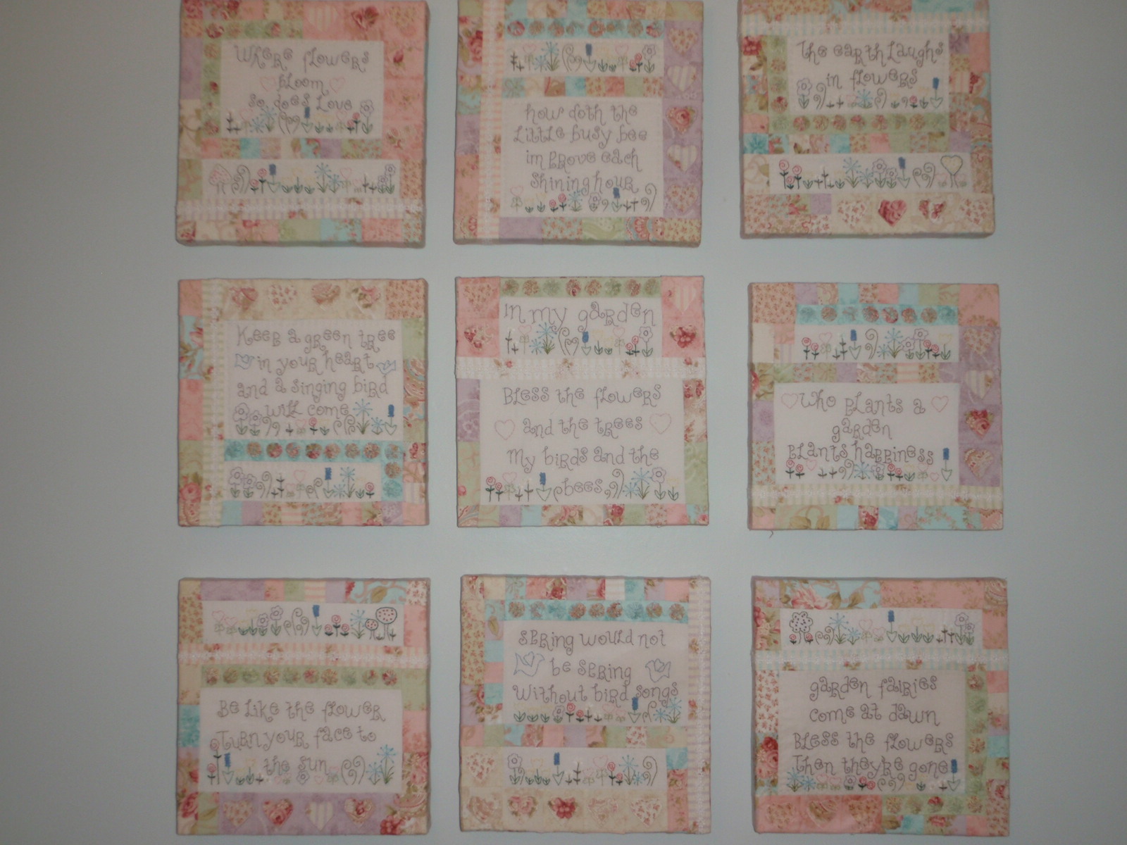 I’ve finished them!!! So excited to have all nine blocks finished and mounted and on the wall!!! (Though I have to confess, even though I measured – with a ruler – I still have several extra holes in the wall behind the blocks while I was hanging them. LOL!!!)