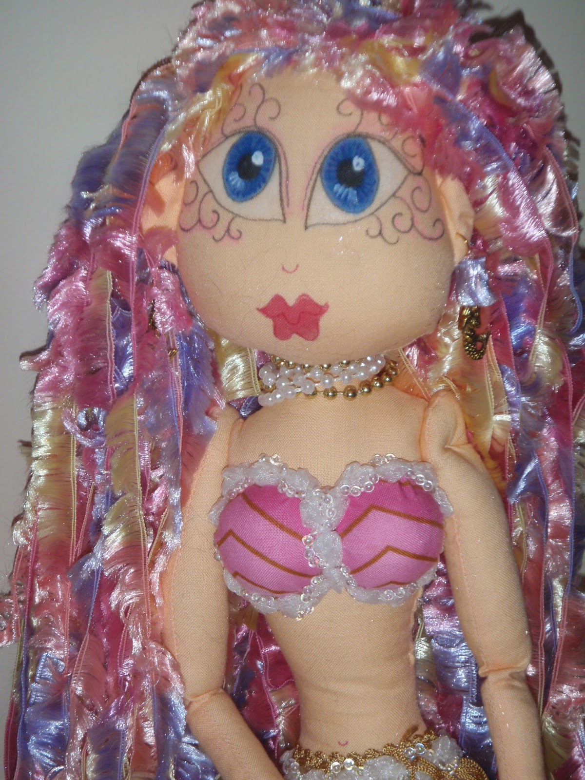 She has a long quilted tail. She is wearing a little bra top. (The top and tail are trimmed with gorgeous organza and pearl trim. Her arms are thread jointed to the body and have posable fingers, elbow and wrist joints.