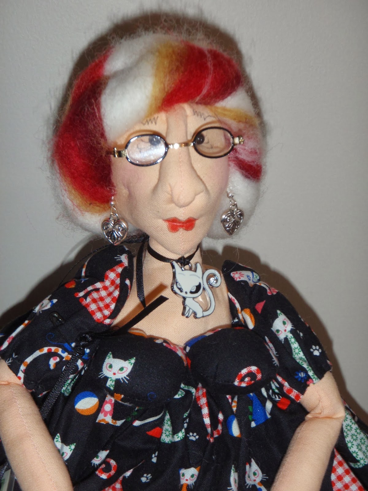 She is wearing a dress with sleeves and has lovely lush boobs. Her hair is wool roving/sliver coiled into a bun. She is wearing spectacles, earrings and charm around her neck. (Her clothes are sewn onto the body and cannot be removed.)