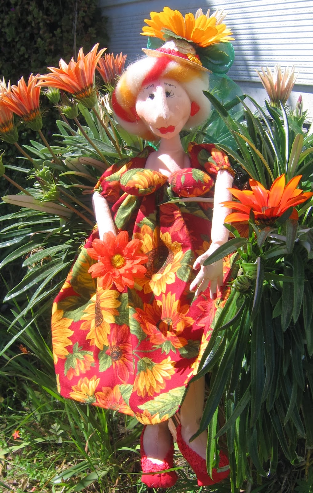 This is a gorgeous and fun cloth soft sculptured doll made in New Zealand by the designer. She has needle-sculpted face , and thread jointed arms with movable wrists, elbows, and knees. She can be posed in a variety of poses (and will not stand without a stand). She has painted shoes.