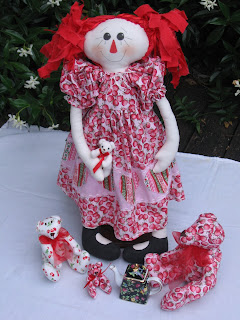 I’m enjoying palaying with the rag doll / raggedy doll idea at the moment. I really like the infinite possibilities. For this doll, I have tied the ‘hair’ to the head by using short lengths of thin satin ribbon. The dress has a contrast heart panel.