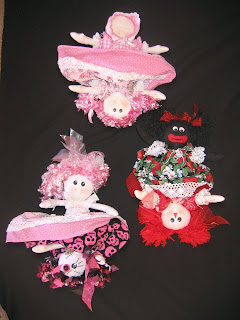 I have been doing shows for many years now, and one doll I often get asked about is the Topsy-Turvy doll. So here is my take on it. I did a baby asllep/girl awake, a princess/goth. and a golly/redhead. I relly enjoyed making these, and will make a pattern for the dolls. First, I have to make more of them, as I sold all my samples at recent shows!!!